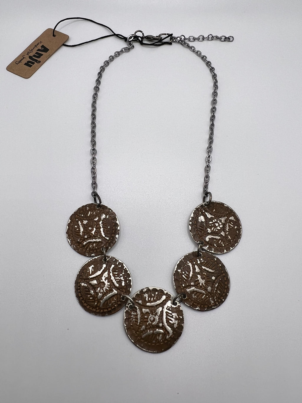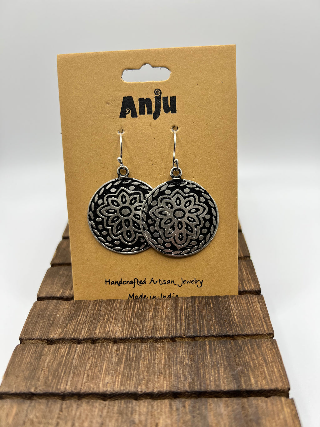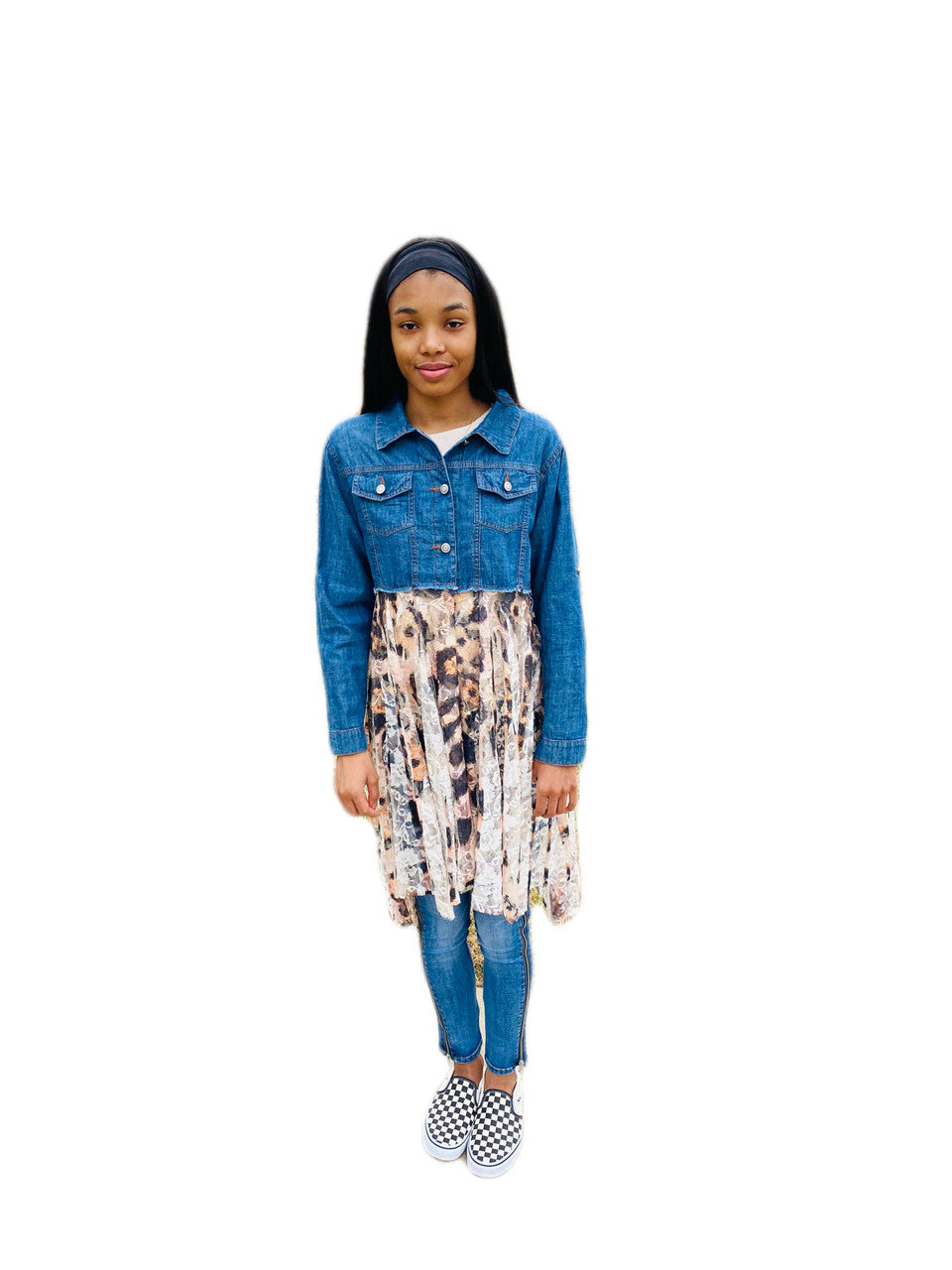 Top is Denim, the bottom is Lace with colors of cream, black, orange and gold.