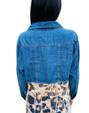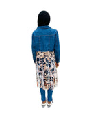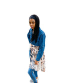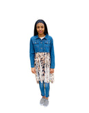 Top is Denim, the bottom is Lace with colors of cream, black, orange and gold.