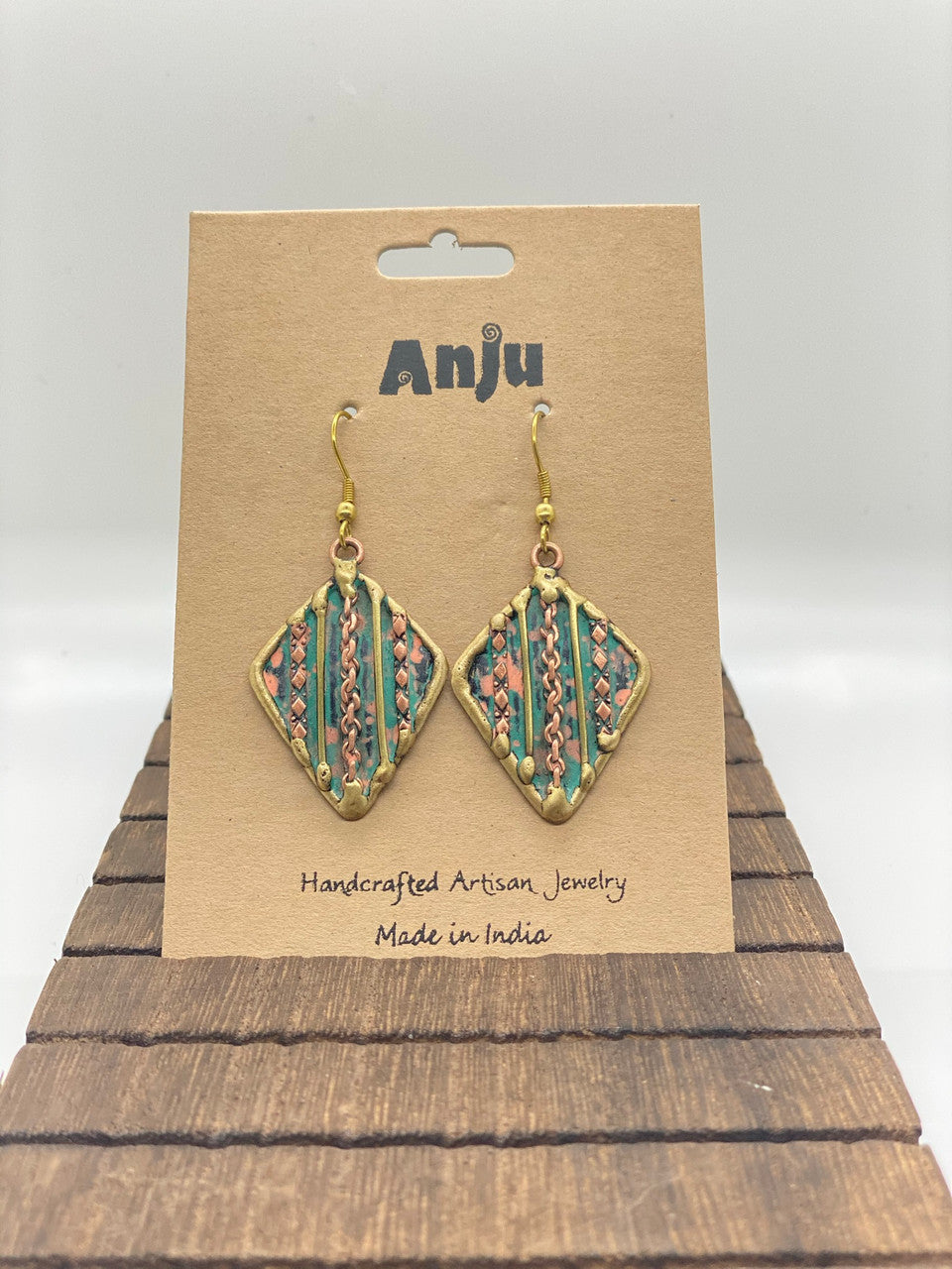 Patina Brass and copper earrings blue/green and peach. Handcrafted from brass and copper wire and soldered with a patina finish.